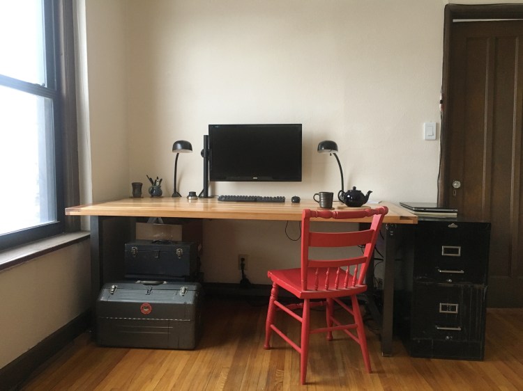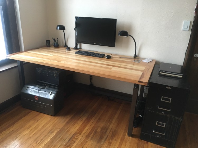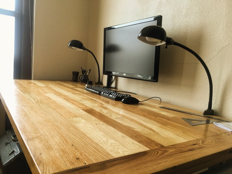 While living in North Dakota and working as the equipment and facilities guy for a nascent meadery-in-development, I got tired of working at a plastic folding table as field-expedient desk. I happened across some hardwood hickory flooring on deep sale at the local home goods store and after some quick math, I bought a box for a song and started to form up a plan.